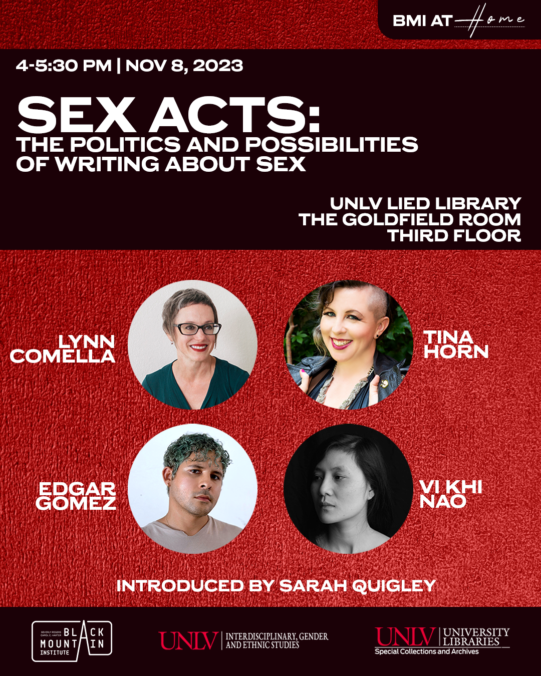 We’ll discuss how to draw from your own experiences, how to use your imagination to experiment, and how to value the erotic elements of your creative life.